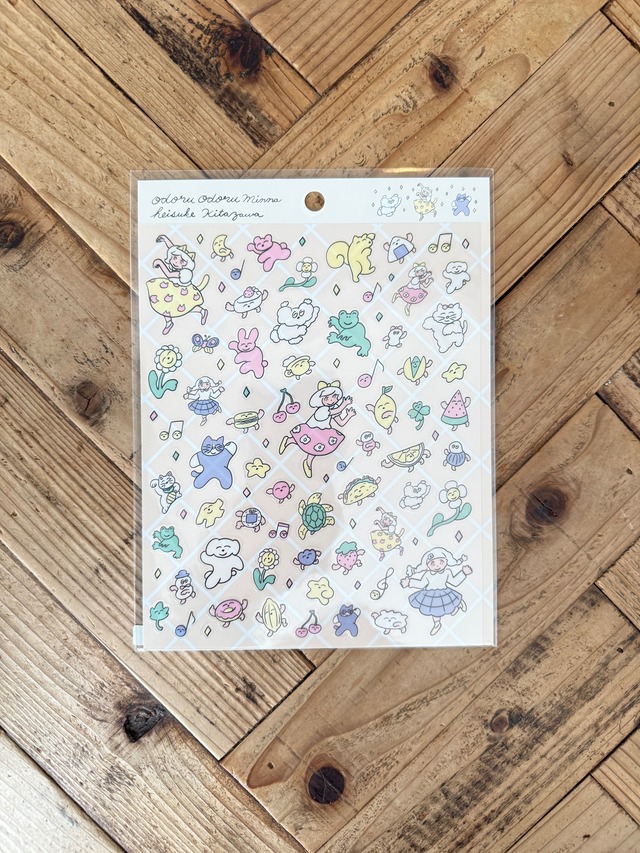 【北澤平祐 シール「おどるおどるみんな」】 イラストレーター・北澤平祐さんのシートシール。 にっこりおんぷの楽しい音楽とともに、みんなでダンス! 女の子も、カエルやネコも、タコスやおにぎり、餃子にスイカも、みんな楽しそう。 キラキラパーツと組み合わせて、いろんなところでみんなを踊らせてくださいね。 シートはA5サイズのノートにちょうど挟めるサイズ。 大きめのシールは小物のワンポイントやステッカーのように、 小さいシールは手帳などに貼ってお楽しみいただけます。 余白部分は透明になっているので、手帳や小物によくなじみますよ。 【仕様】 台紙サイズ:141 × 188 mm シールシートサイズ:138 × 170 mm
