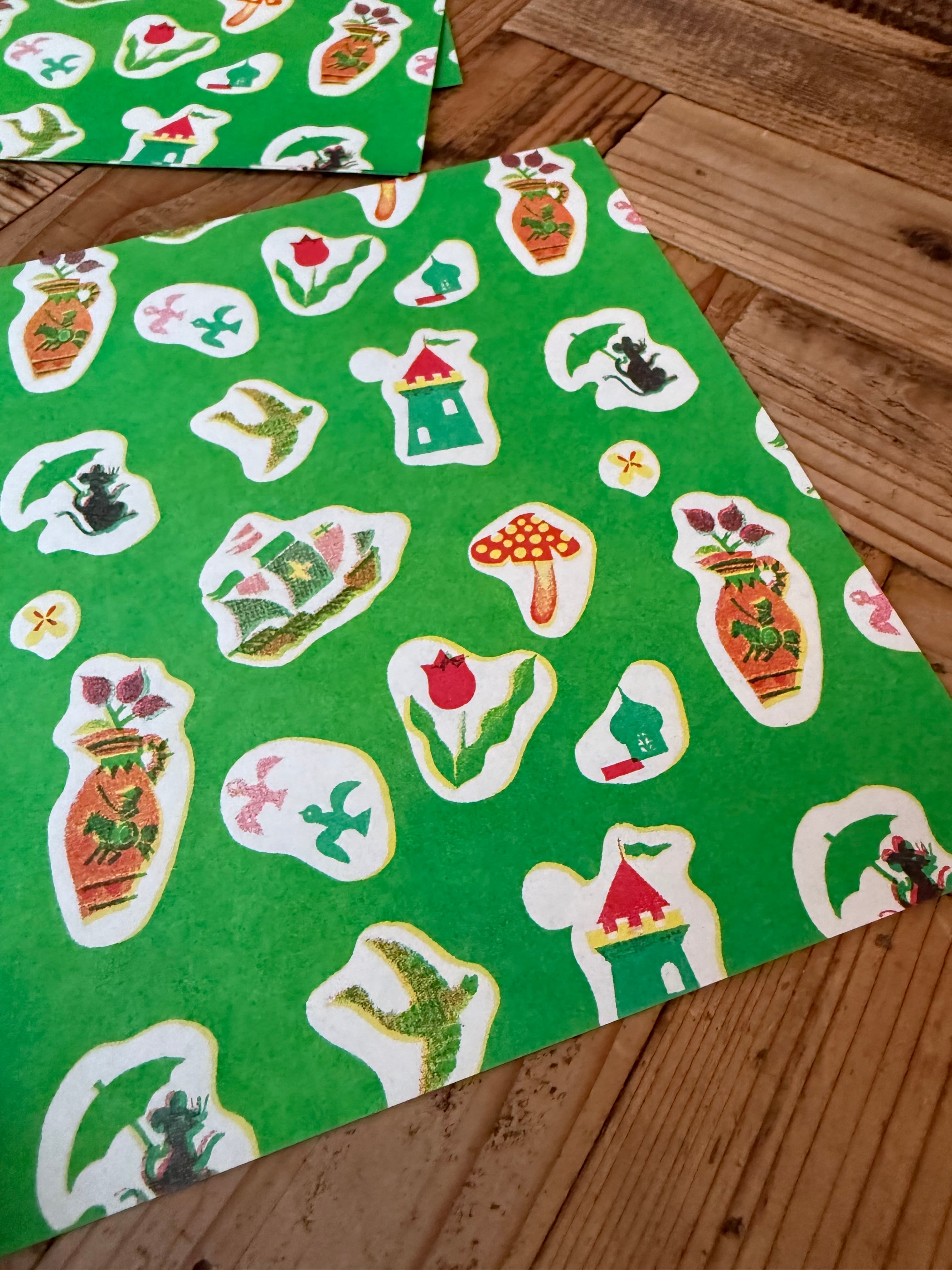 少しずつコレクションを増やしていき、2006年頃より大正時代の羽裏(羽織の裏地)のモダンな図柄や昭和初期の子供用の着物の可愛い図柄や、昭和30年代の千代紙のシュールな図柄の魅力を活かし、懐かしい風合いのペーパーにそれらを印刷し「モダンJAPAN復刻ペーパー」としてペーパーアイテムの販売を開始しました。
