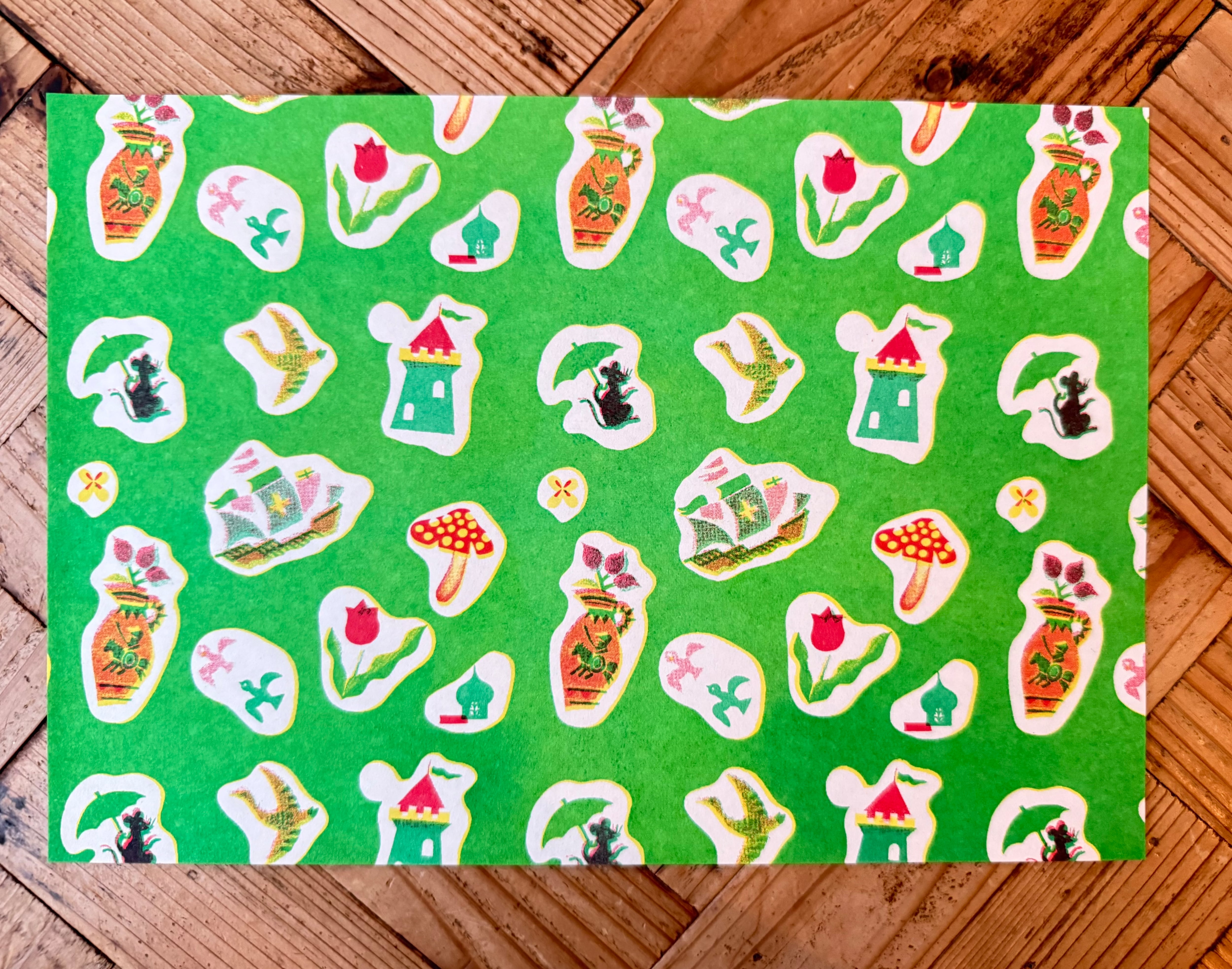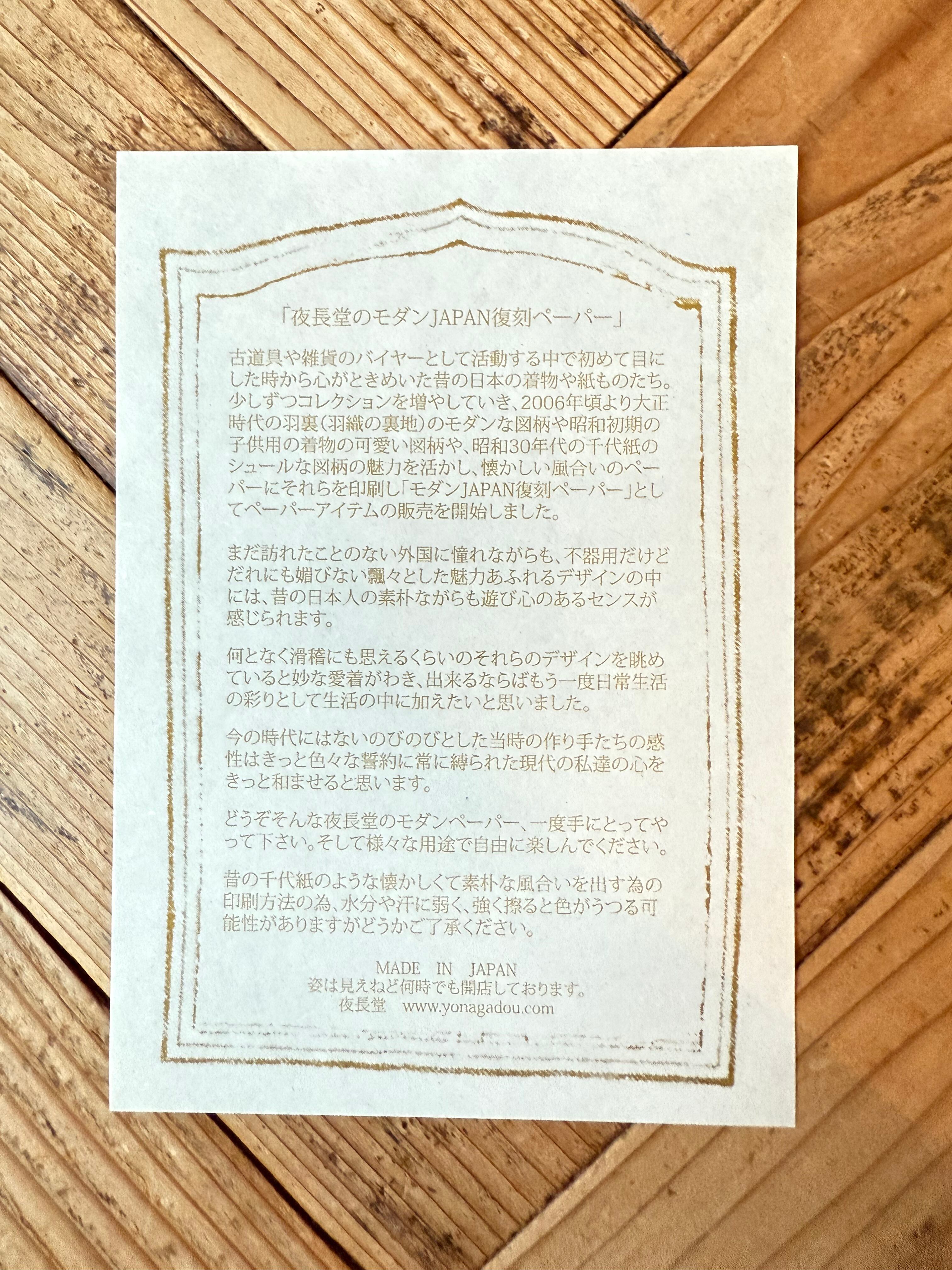 懐かしいイラストにレトロな風合いのペーパーを用いて印刷した夜長堂のペーパーは