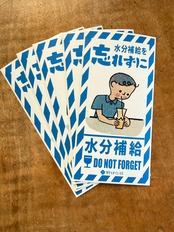 男の子が美味しそうに水分補給をしている「水分補給を忘れずに」シールです。