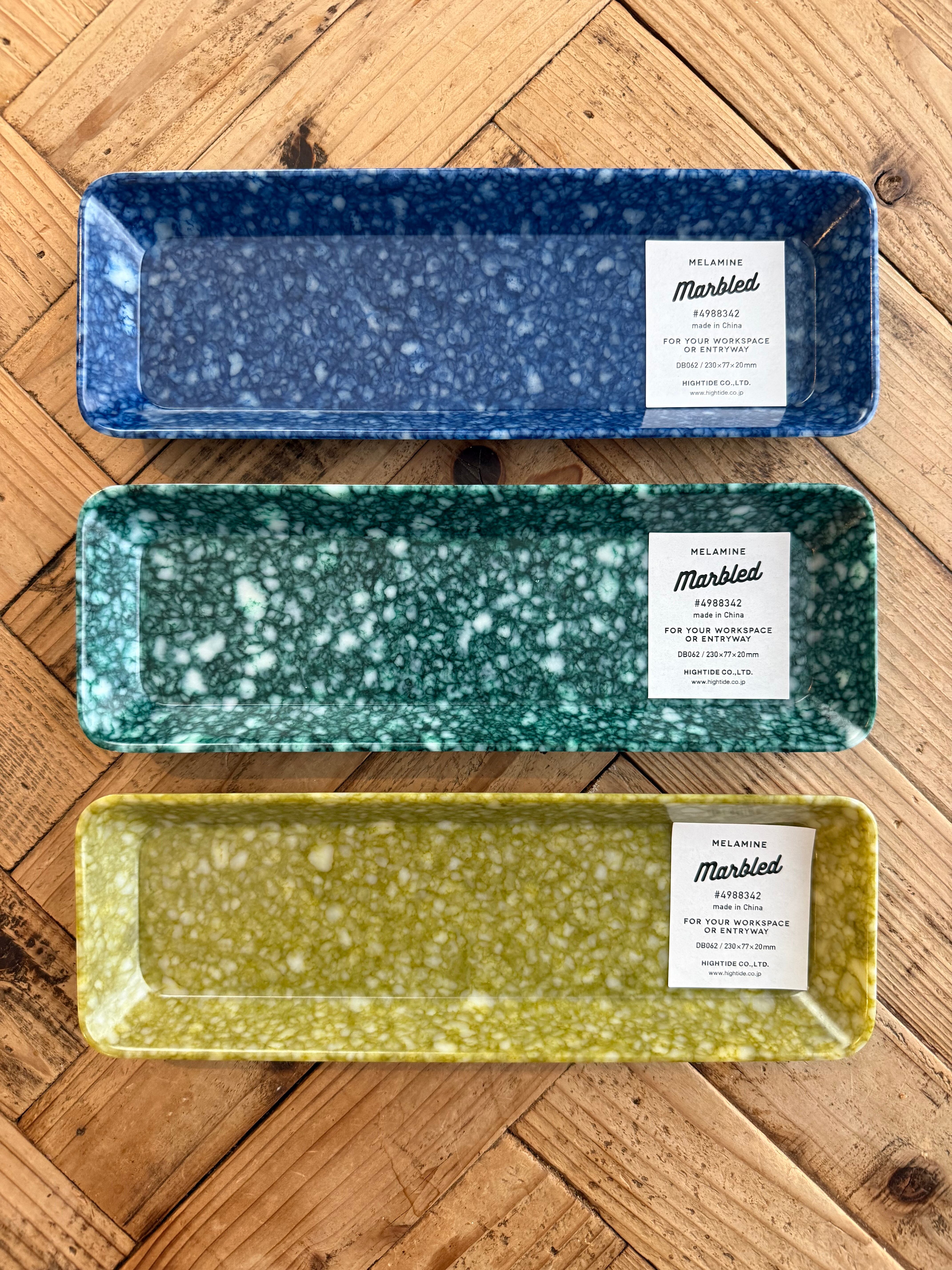 濃薄などに個体差があり、味わいあるの表情が魅力のマーブル柄のシンプルなメラミントレイです。